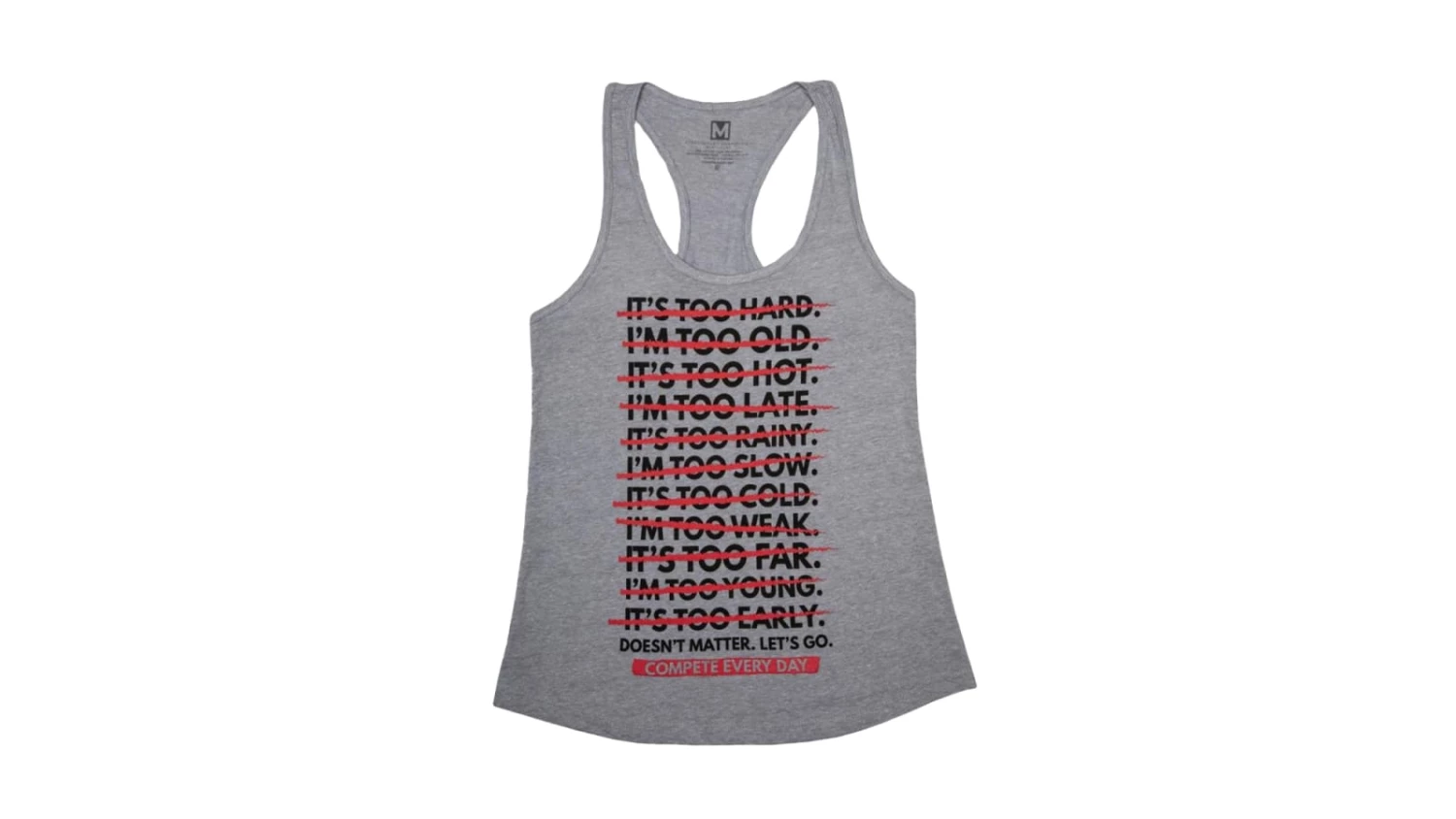 Excuses are easy, obstacles are everywhere. “Doesn’t matter, let’s go.” This women’s racerback tank top from Compete Every Day is made from a breathable, polyester-viscose blend material with low-cut arm holes for a full range of motion.
