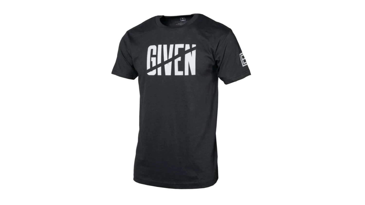 The “Earn It” men’s t-shirt is made from a lightweight, flexible, athletically contoured cotton-poly blend material, ideal for the gym. Available here in black, this exclusive design includes the word GIVEN across the chest in silver with a line through it.