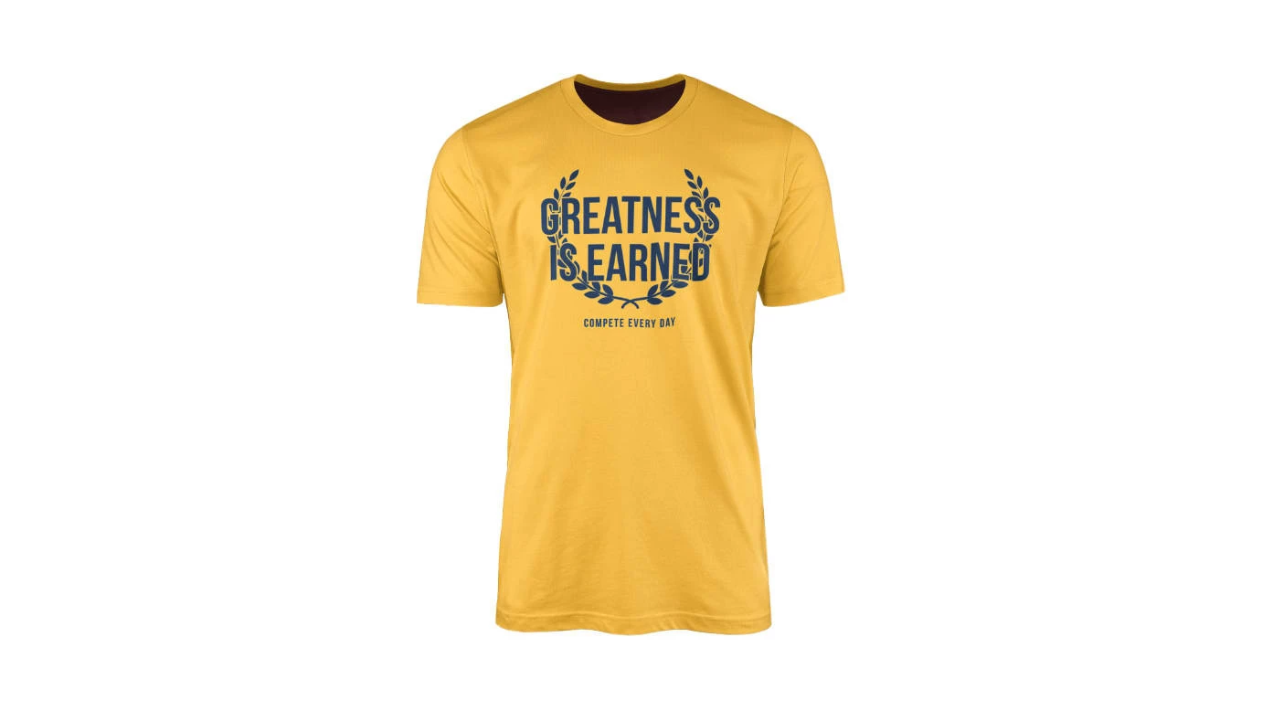 This men’s crewneck tee from Compete Every Day is available here in yellow and features the slogan “Greatness Is Earned” across the chest in blue. Made from a flexible and lightweight tri-blend material, this design offers a free range of motion in the gym and optimal comfort as casual wear.