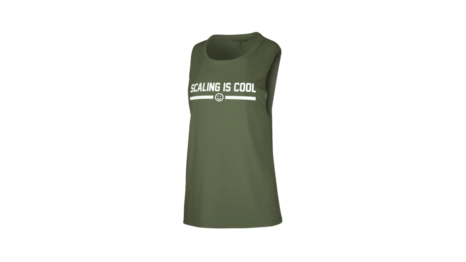 This quality cotton-poly wommen’s muscle tank is available here in olive green with CrossFit Linchpin’s smiley face design and one of its central mantras across the chest in white: SCALING IS COOL.