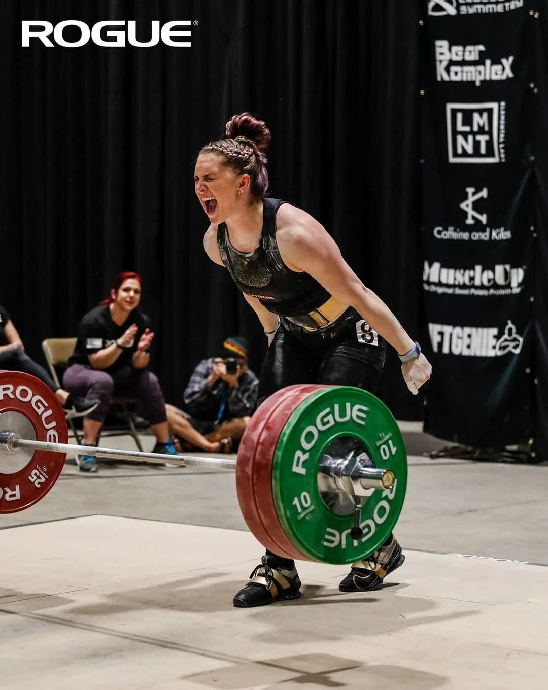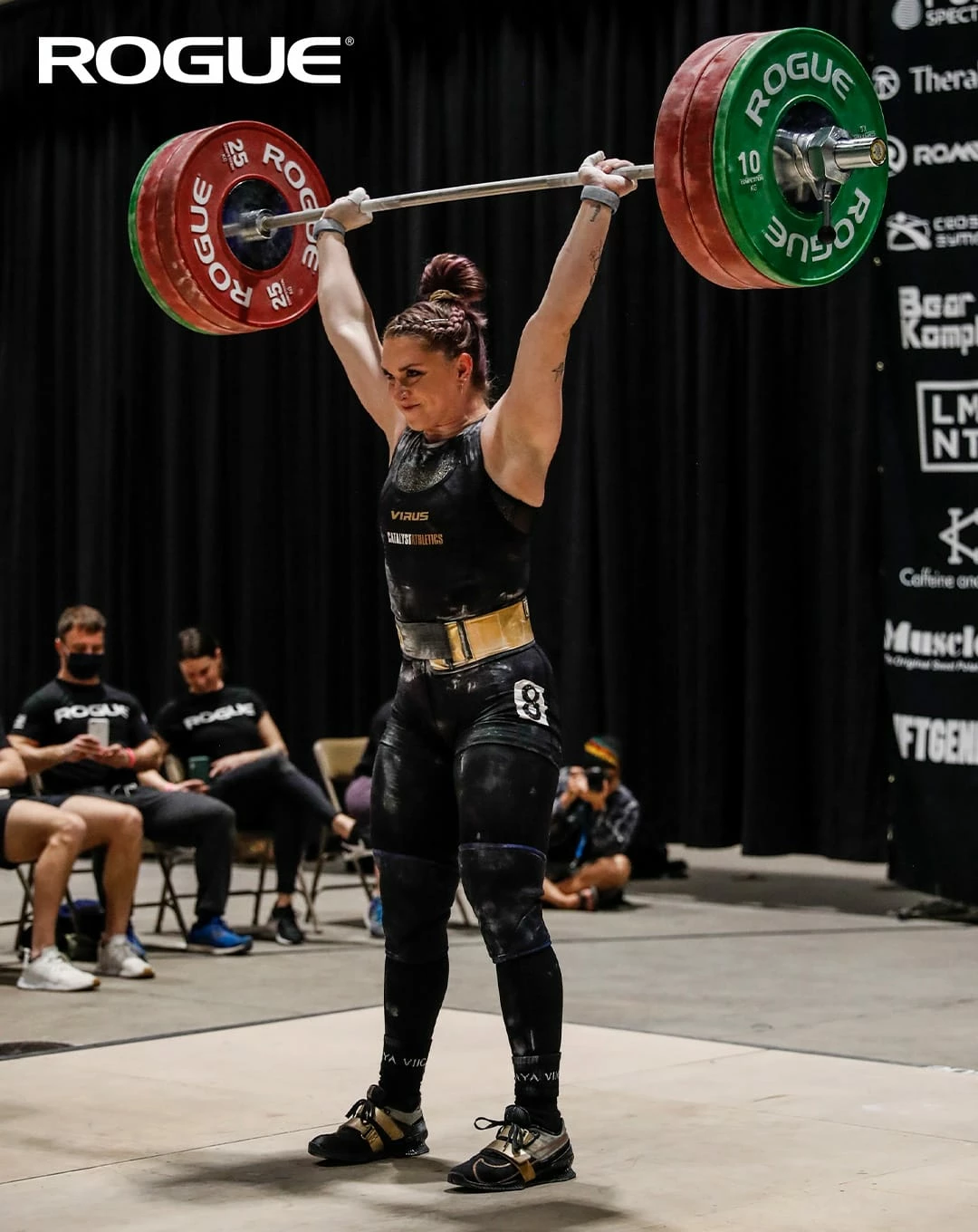 The Skull n’ Roses tee is the latest Signature shirt design inspired by Rogue athlete Mattie Rogers, one of USA Weightlifting’s most decorated athletes. Available here in black with green print, this flexible, athletic-cut t-shirt includes original artwork on the back (a skull and roses graphic print) and the slogan “Head Down, Eyes Forward” across the chest. Rogue branding is also featured on the left sleeve.