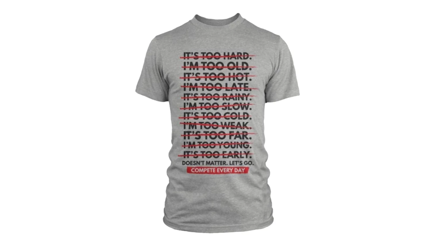 Available here in gray, the exclusive design includes a litany of common excuses for not competing, all crossed out in red, followed by the inspirational company mantra.
