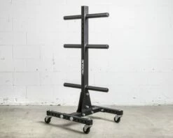 The simple, old-school plate tree is still the gold standard when it comes to efficient bumper storage at affiliates and garage gyms around the globe. That said, there’s always room for a little refinement. Rogue’s updated Vertical Plate Tree—built in the USA—improves on traditional models with a reinforced triangle-plate base, optional wheels for mobility, and re-positioned posts that enable full-size Oly plate storage on all three tiers. The unit’s new bolt-together design also reduces shipping costs while maximizing overall stability.