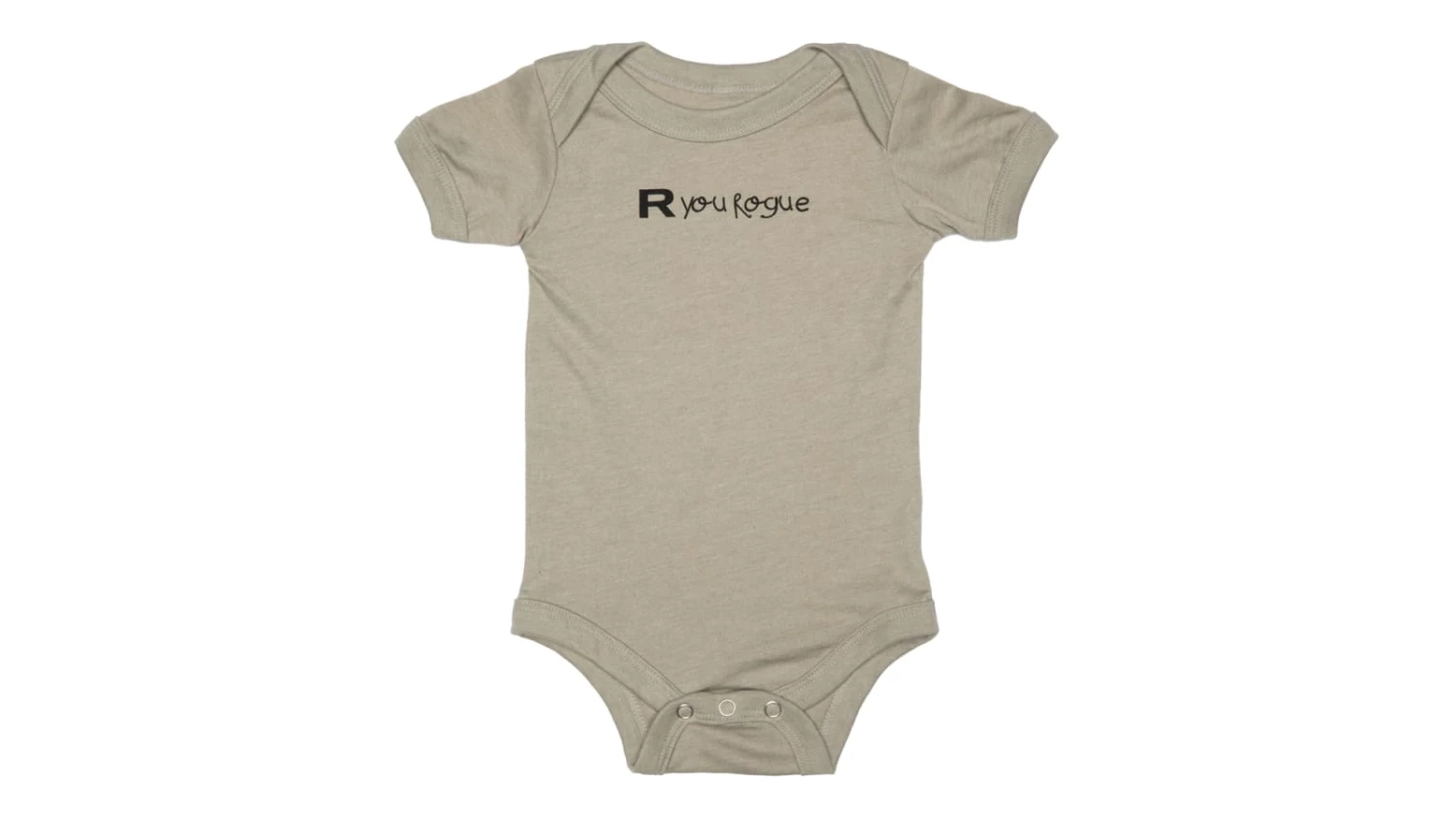 The “R You Rogue” Onesie is well suited for the pint-sized future athlete in your home. Available here in Stone Heather with the stylized slogan across the front in black, each short-sleeve onesie is made from a soft cotton + polyester blend jersey fabric.