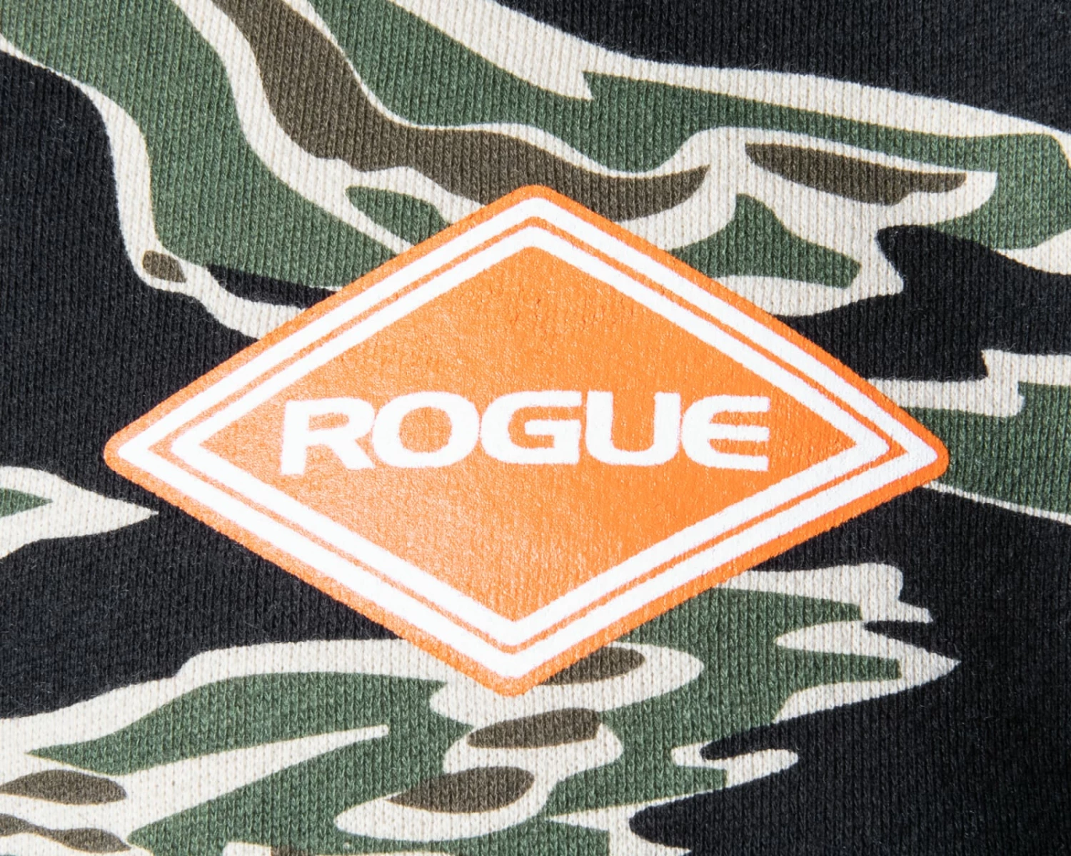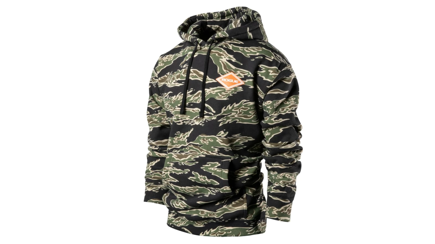 Rogue’s Tiger Camo Hoodie is made from a premium, heavyweight cotton-poly blend fabric with a fleece-lined hood, heavy gauge round drawcord, nickel eyelets, classic kangaroo pouch, and 1×1 ribbing at the cuffs and waistband.
