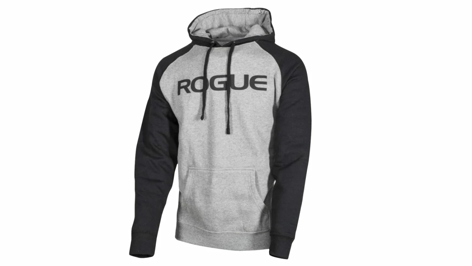 Layer up in this quality cotton-poly hooded sweatshirt. Featuring a more contoured, athletic cut and greater flexibility than many store-bought workout pullovers, the Rogue Hoodie is available here in light grey with a black hood, black sleeves, and black Rogue logo across the chest.