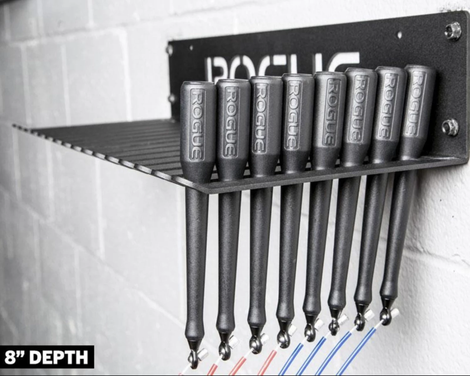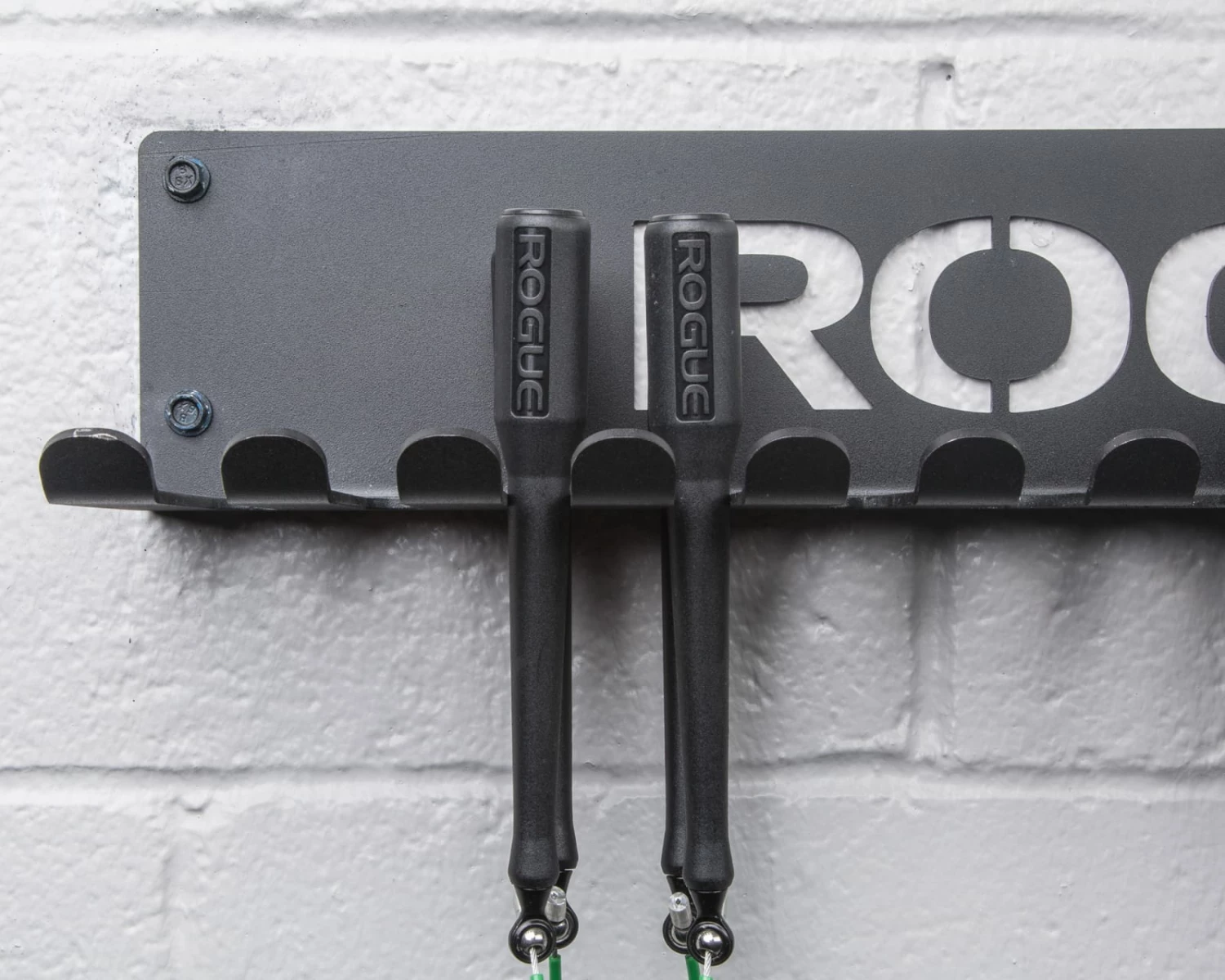 The compact, Laser cut 11-Gauge Steel Rogue Wall Mounted Jump Rope Hanger is a must-have for any growing training facility. Manufactured in the USA and finished in our signature black powdercoat, this convenient organizer rack measures 23.5″ across with an optional depth of either 5.125″ or 8.125″ (Depth) from the mounting plate to the end of each hanger section. The Rogue logo is prominently laser-cut across the back panel.