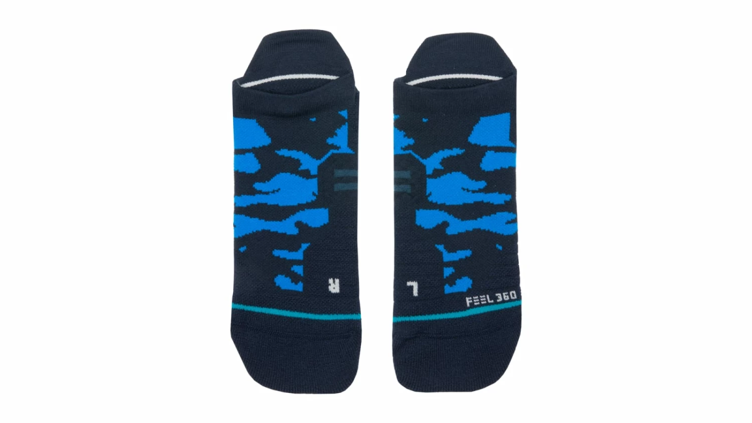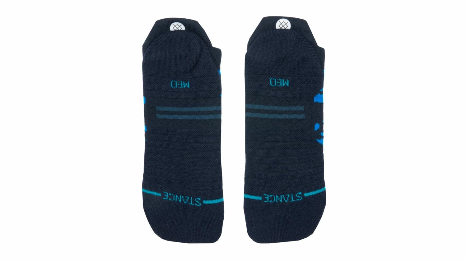 The nylon blend Kilicker Tab Sock from Stance is equipped with a seamless toe closure, special anatomical cushioning, and mesh airflow panels to keep your feet cool and comfortable; all combined with a unique light-blue-on-navy graphic pattern.