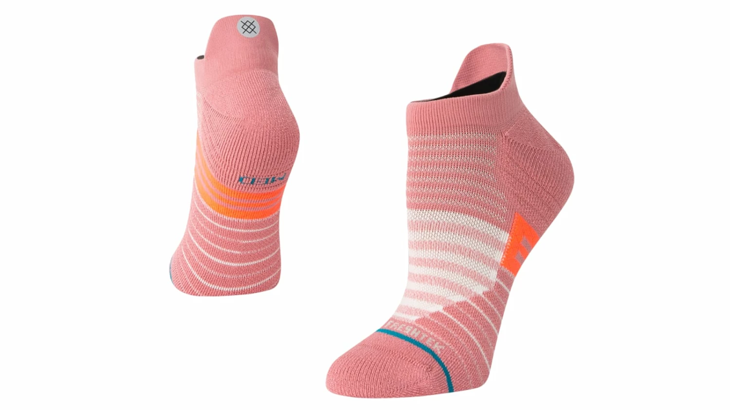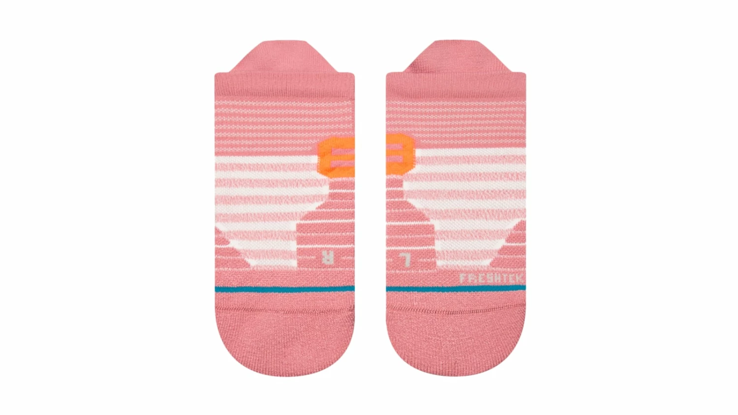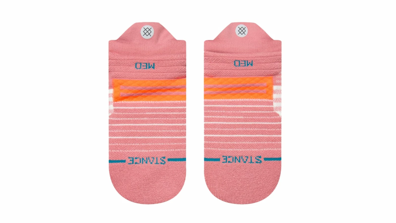 The Strive Tab Sock from Stance, available here in “dusty rose” pink with white and orange accents, is equipped with medium cushioning, mesh airflow panels, and a protective rear tab. This low-rise athletic sock also features Stance’s advanced FreshTek and InfiKnit technology, which help prevent tears and eliminate odor and moisture as you train.